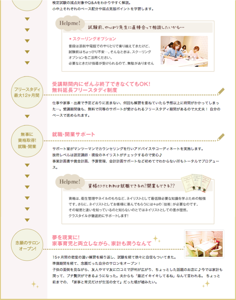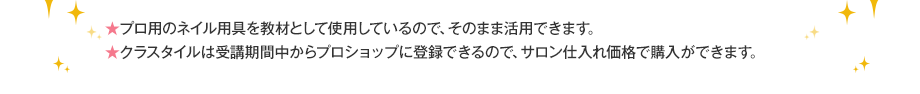 仕事や家庭を持ちながら憧れのネイリストになるなんてムリ…なんて諦めるには、まだ早い! 一流のネイリスト陣がそろった「CLASTYLE」が、独自のカリキュラムと丁寧な指導で夢の実現を強力サポートします。
