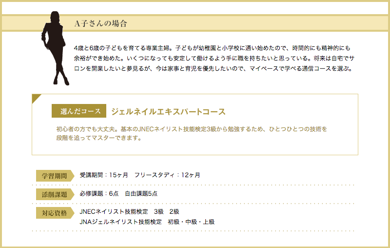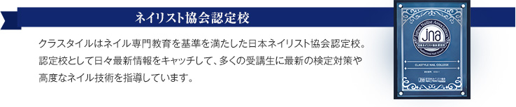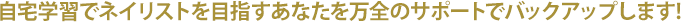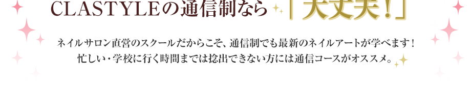 ネイリスト育成専門学校クラスタイルカレッジの『通信制コース』として、 通学コースに準ずるカリキュラムが自宅で修得できるプログラムです。 一般的な通信講座や通信教育では資格取得が困難な、 ネイリスト技能検定1級・ジェルネイル技能検定上級の取得に対応するために、 常駐のネイル専門スタッフによるサポート体制を整えています。